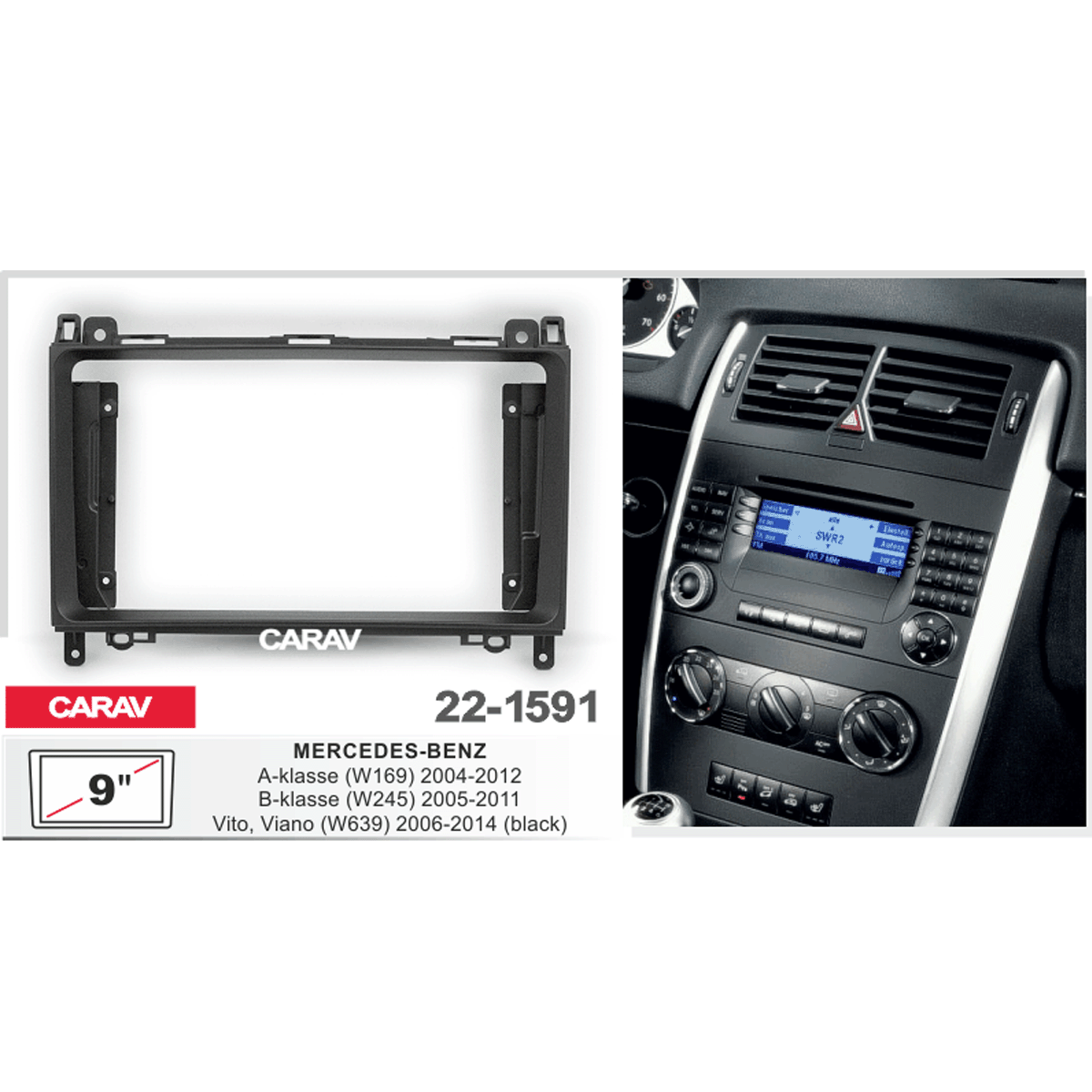 MARCO PARA LA INSTALACIÓN DE RADIO CARAV 22-1591: 2 DIN / 9 PULGADAS / 230:220 x 130mm Mercedes-Benz Clase A W169 (2004-2008) Mercedes-Benz Clase A W169 (2008-2012) Mercedes-Benz Clase B W245 (2005-2009) Mercedes-Benz Clase B W245 (2009-2011) Mercedes-Benz Viano W639 (2010-2014) Mercedes-Benz Vito W447 (2014-presente) Mercedes-Benz Vito W639 (2003-2010) Mercedes-Benz Vito W639 (2010-2014) • Color: Negro • 3D diseñada digitalmente • Fábrica de estilo textura • Construido de alta calidad, alto calor de automoción de grado plástico ABS • Los kits de coincidir con el de la fábrica de guión se adapta perfectamente • Precisión soportes y separadores de hacer la instalación fácil y segura • 100% satisfacción garantizada
