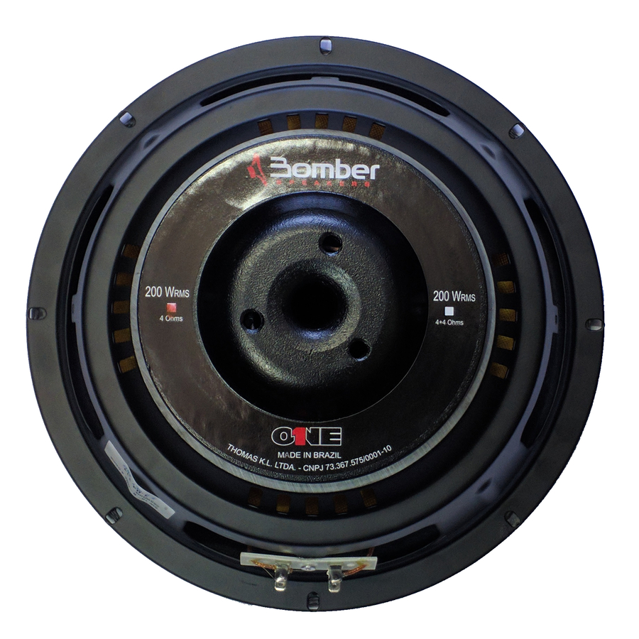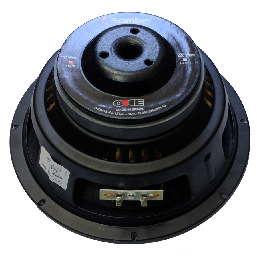 Especificación técnica: • Modelo Bomber One • Diámetro Nominal: 10 Pulgadas • Potencia RMS: 200W • Potencia PMPO: 400W • Impedancia: 4 Ohmios • Bobina sencilla • Respuesta de frecuencia: 41Hz • Sensibilidad: 84,8dB • Fs: 41Hz • Qms: 4,97 • Qes: 0,65 • Qts: 0,57 • Vas: 18L • Xmax: 4,7mm • Sd: 226cm²